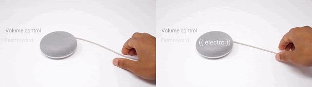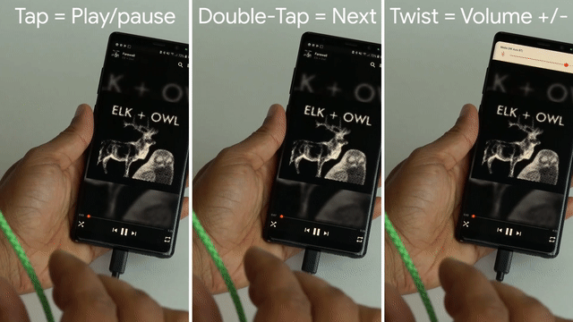 同时使用连续(扭转/旋转)和离散手势(捏/拍)来控制音乐播放的交互式音箱线