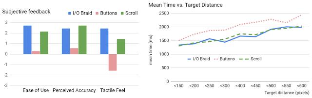 左:经过加权平均处理的主观反馈。我们将李克特 7 点量表映射成 [-3, 3] 范围内的分数,并乘以技巧得到该评分的次数,然后计算所有得分的平均值。右:目标距离的平均完成时间显示按钮的速度一直较慢