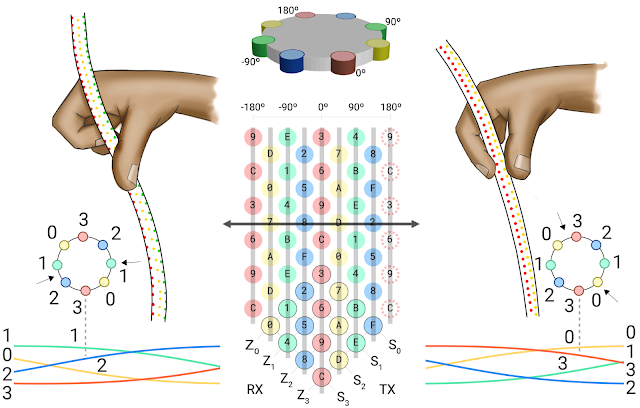 一个重要规律是 HSM 中的两个轴向柱共用一组电极(并在矩阵横截面图中以彩色标出),这两个轴向柱在彼此的正对面。因此,捏和旋转细绳会激活一组电极,我们可借此追踪这些轴向柱的相对运动。旋转检测可识别随时间变化的正弦信号集(90º 抵消)的当前相位。线状编织物结构使用户能够在任意位置进行旋转,还可使用一小组电极进行扩容。