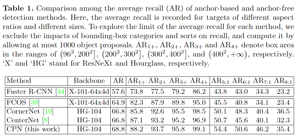 主要对四种object proposal提取方法进行了对比,并在MS-COCO验证数据集上进行了评估。结果显示,anchor-free方法通常具有更高的整体召回率,这主要是由于它们在两种情况下的优势:首先,当目标对象非常大,例如,大于4002像素时,基于anchor的方法Faster R-CNN将不会有更高的召回率。其次,当物体的长宽比变得特殊时,如5 : 1和8 : 1,Faster R-CNN的召回率非常低,在这种情况下,召回率明显低于CornerNet和CenterNet,因为没有预定义的anchor可以适应这些物体。在FCOS中也有类似的现象,FCOS是一种ancor-free的方法,它用一个关键点和到边界的距离来表示一个目标对象,但是当边界离中心很远时,FCOS通常很难预测一个准确的距离。而CornerNet和CenterNet方法将角点(和中心)关键点归为一个目标object,它们在某种程度上摆脱了这个麻烦。因此,本文的方法选择anchor方法,特别是点分组方法(CornerNet和CenterNet),以提高目标检测的召回率。同时,本文的CPN继承了CenterNet和CornerNet的优点,对物体的定位有更好的灵活性,尤其是形状奇特的物体。