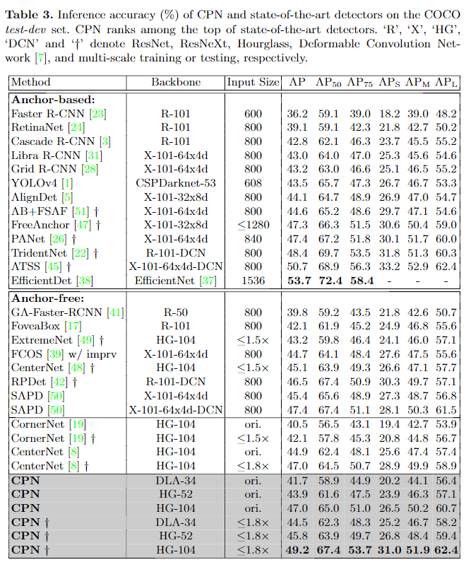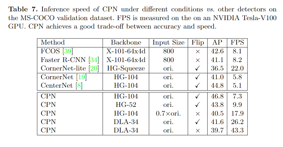 CPN的有效性已在MS-COCO数据集上得到验证,具体使用104层堆叠式Hourglass网络作为主干网络,CPN在COCO数据集上的AP为49.2%,比之前最好的anchor-free目标检测算法CenterNet 高2.2%。尤其,CPN在检测具有特殊形状(例如很大或很小的面积或极高长宽比)的物体时具有更高的精度增益,这证明了使用anchor-free方法进行proposals提取的优势。同时,CPN使用较轻的主干网络DLA-34 并在推理环节不使用图像翻转数据增强策略时,在26.2 FPS时可达到41.6% AP,在43.3FPS时达到39.7% AP,在相同的推理速度是,性能超过了大多数的目标检测算法。