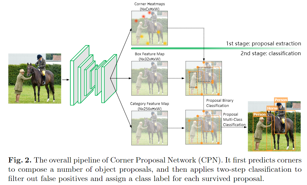 本文的方法被称为Corner Proposal Network(CPN)。它通过定位目标的左上角和右下角,然后为其分配类标签来检测目标对象。具体地,首先利用CornerNet的关键点检测方法,并进行改进,不是将关键点与关键点特征嵌入分组,而是将所有有效的Corner角点组合枚举为可能的proposals目标对象。这导致了大量的proposals,其中大多数是误报。然后,训练一个分类器,以根据相应的区域特征从不正确配对的关键点中区分出真实目标对象。分类有两个步骤,首先是一个二进制分类器,它过滤掉大部分proposals(即与目标对象不对应的proposals),然后,对筛选后的目标对象重新排序类别分数。