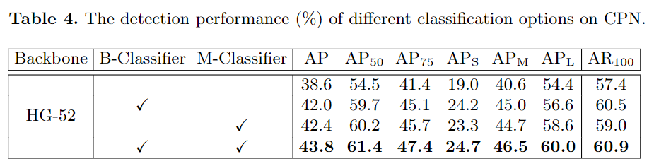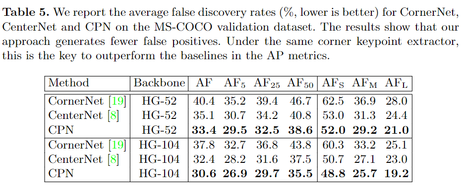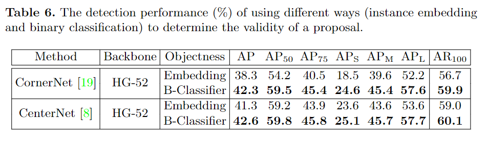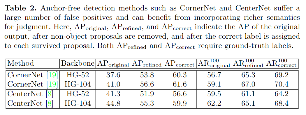 以具有高召回率的CornerNet和CenterNet为例。如表2所示,具有52层和104层Hourglass 网络的CornerNet在MS-COCO验证数据集上实现了37.6%和41.0%的AP,而很多检测到的 "目标 "都是假阳性false positives。无论是当删除object proposal,还是给每个预备的object proposal分配一个正确的标签,检测精度都会显著上升。这个结果在CenterNet上也是成立的,它增加了一个中心点来过滤掉假阳性样本,但显然没有把它们全部删除。为了进一步缓解这个问题,本文的方法需要继承两阶段方法的优点,即提取proposal内的特征,并训练一个分类器来过滤掉假阳性样本。