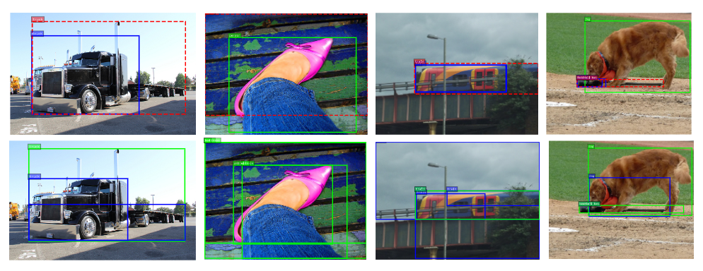 图1.现有物体检测方法的典型错误。第一行:基于anchor锚的方法(如Faster R-CNN)可能难以找到具有特殊形状的物体(如尺寸非常大或长宽比极端的物体)。第二行:anchor-free方法(如CornerNet)可能会错误地将不相关的关键点归入一个物体。绿色、蓝色和红色边界框分别表示真阳性、假阳性和假阴性。