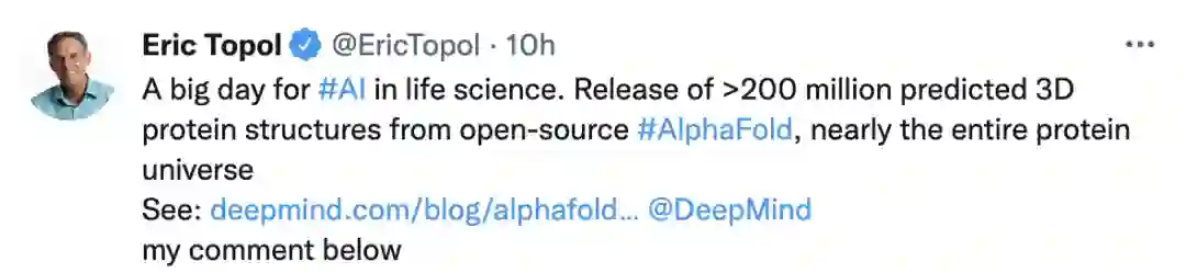 这位号称美医学界「世纪医生」的Eric Topol,对这个「里程碑」表示赞许:这是AI在生命科学领域的「大日子」,超过2亿个预测的3D蛋白质结构,几乎囊括了整个蛋白质宇宙!