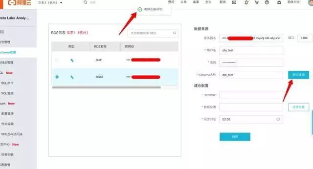 这个页面的左边列出了你所有的RDS,这是我们要建仓的数据来源,选择其中您要建仓的RDS,右边的服务器名,端口会自动填上,然后您需要填上用户名,密码,以及要同步的RDS的库名。