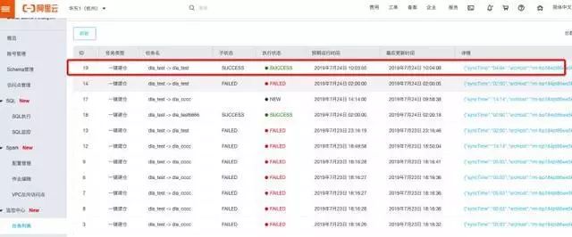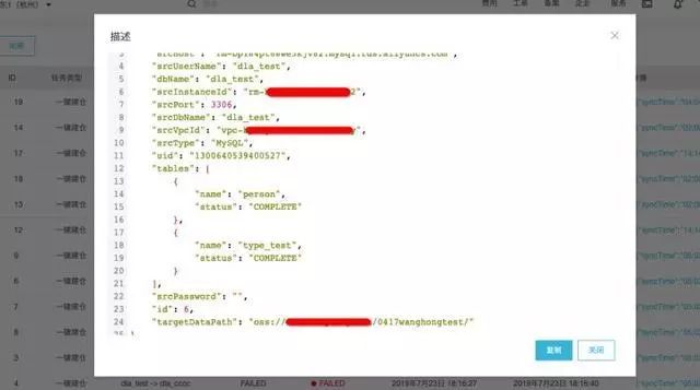 这里可以看到执行的任务的类型,名称,状态,点击详情可以看到JSON格式的更详细的状态信息:哪些表正在同步,哪些表已经同步完成: