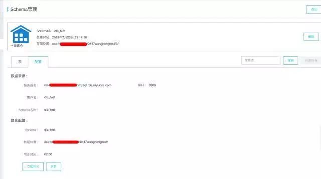 如果有修改一键建仓配置可以点击更新。比较有意思的是这个“立即同步”的按钮,一键建仓建立好了之后,我们只是建立了一个空的数据库,没有马上进行同步,而是要等用户设定的时间才运行,以免影响线上业务。