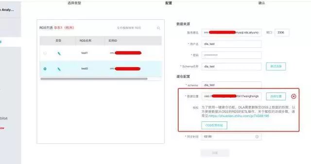 这里同步时间要注意下,应该选择半夜业务低谷的时候进行同步,避免影响线上业务。另外选择数据位置的时候我们会对您赋予DLA的OSS操作权限进行校验,如果没有赋予足够的权限,我们会做提示: