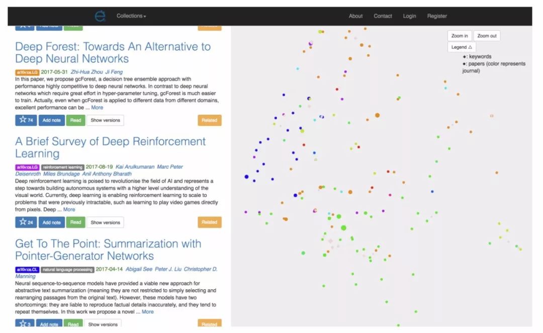 Etymo 的数据库每天更新。更新时,首先用 Doc2Vec 和 TF-IDF 算法对每篇新文章建立表示向量。然后用 t-SNE 找到文章的位置,将 1000 维的表示向量降维到 2 维,即文章的坐标(x,y)。基于相似性的网络的节点数量对应数据库中文章的数量。实验中发现,基于网络的评分可以通过高亮重要文章来优化搜索结果。