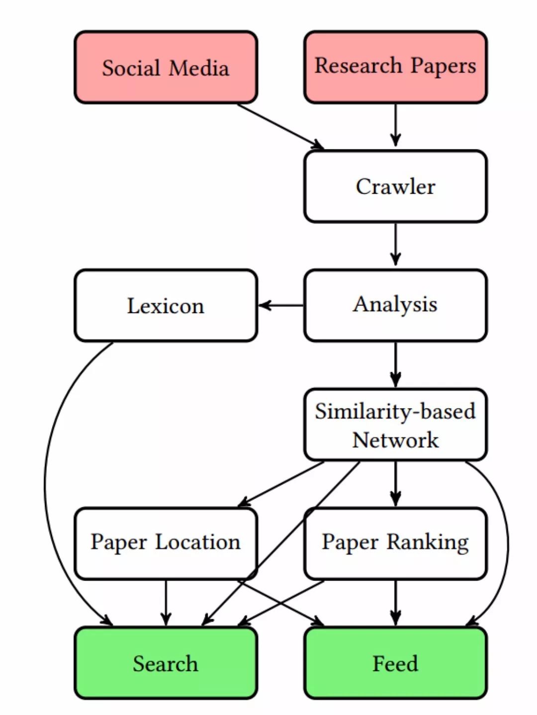 作者通过探索论文在社交媒体上的活动(例如在 Twitter 上被转发的数量),以及用户反馈的信息,对网络的连接进行增强或减弱,来提升排序算法,并且过滤掉不需要的论文。产生的结果图用于排序、推荐和可视化。作者结合 PageRank 和 Reverse PageRank(反向 PageRank)对论文进行排序。在反向 PageRank 中,作者将图的边进行方向反转,再计算 PageRank。作者设计了一个新的搜索界面,将搜索结果显示为一个项目列表和项目关系图。该新界面可以让读者快速锁定相关文献。