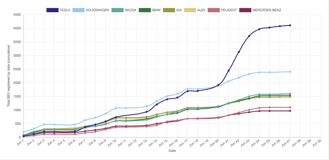 今年6月欧洲14国市场各品牌新能源车销量,图源EU-EVs