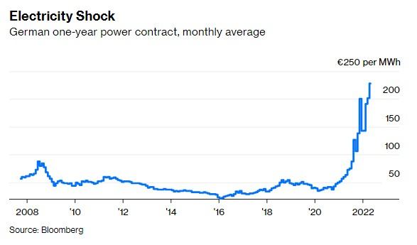 作为欧洲汽车工业重地,德国电价居高不下。今年以来,德国一年期电力远期合约平均每兆瓦时222欧元(合235美元),接近有史以来最高月度水平,高于去年12月创下的每兆瓦时207欧元的纪录。