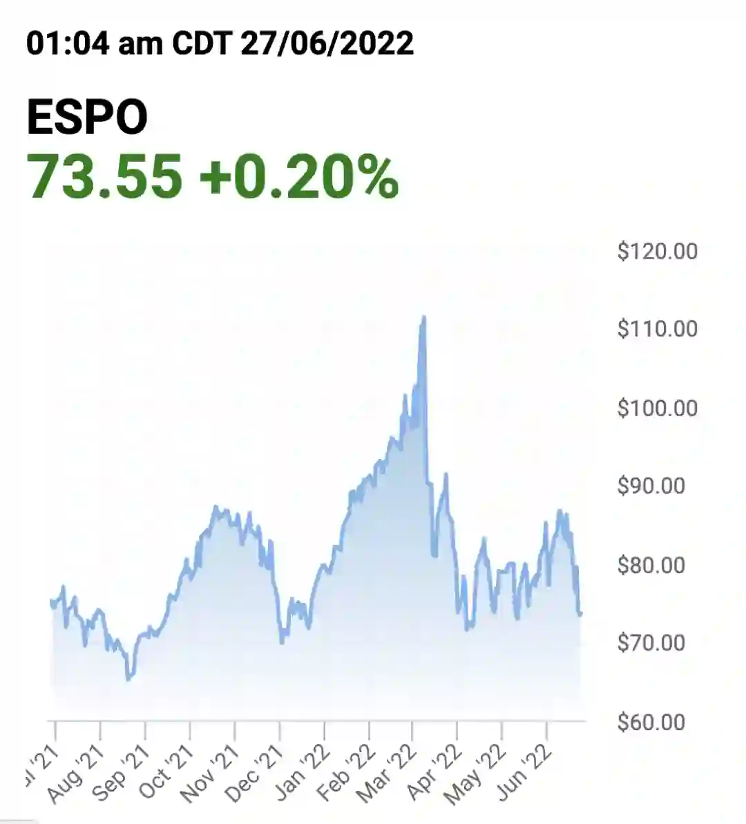 近一年俄罗斯混合原油ESPO的价格变化,图源Oilprice