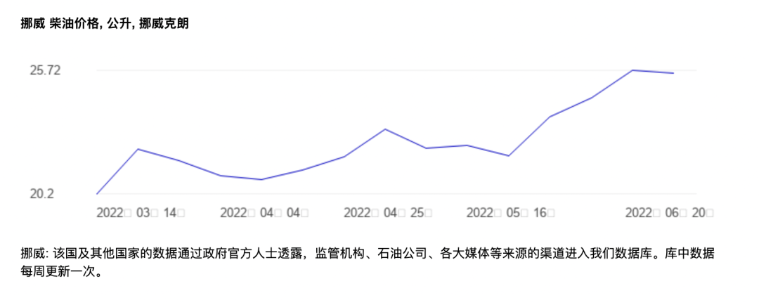 挪威的燃油价格也从今年3月到现在出现一定幅度的涨价。据追踪车用燃料零售价格的网站Global Petrol Prices的数据,近三个月来,挪威柴油价格最低位3月14日的20.20(挪威克朗每公升),至6月13日涨至25.72(挪威克朗每公升)。相比之下,世界各地的平均柴油价格为18.90挪威克朗。