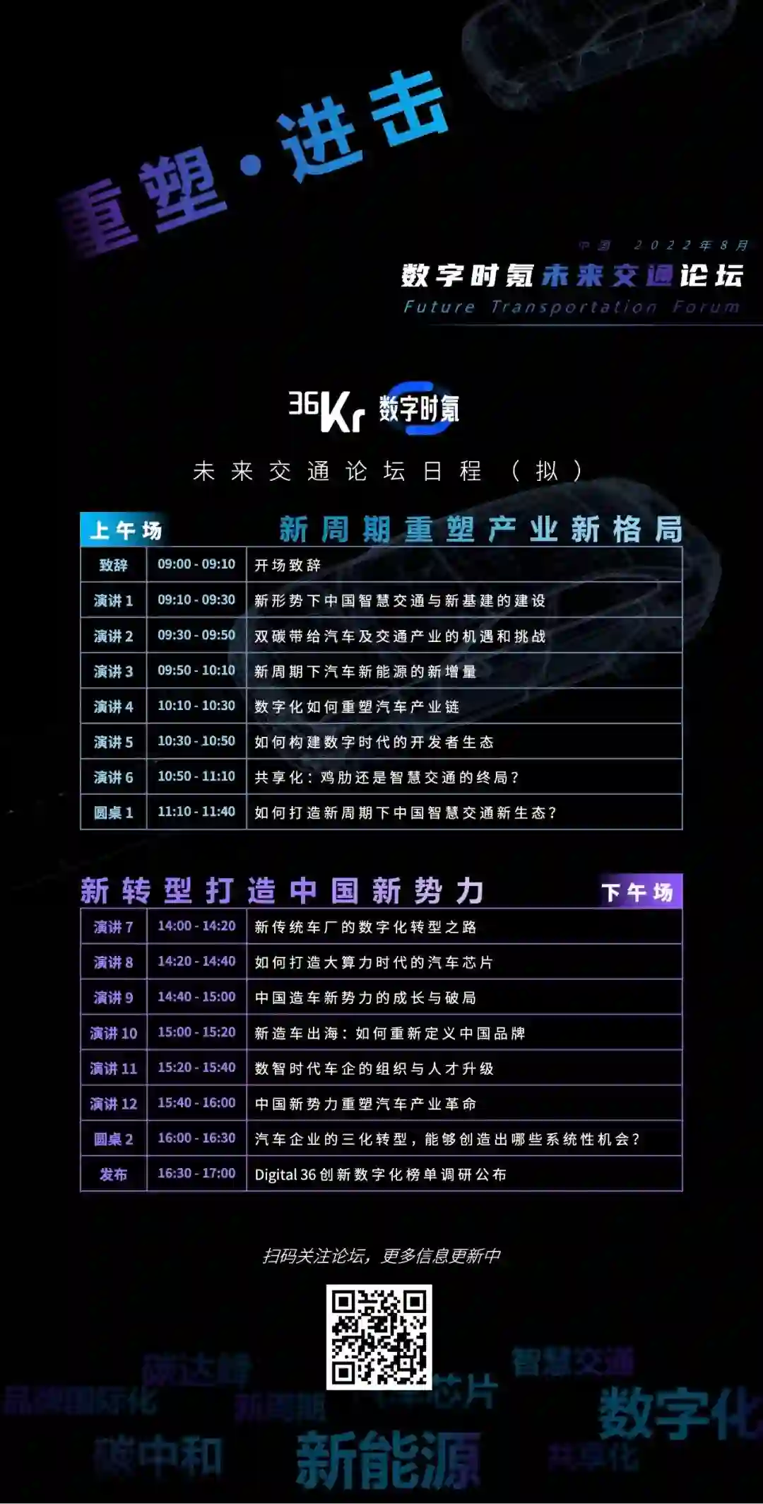 8月18日,36氪数字时氪将举办一场探索汽车行业未来的峰会「未来交通论坛」,关于未来交通你想知道的、不知道的一切,可以在「未来交通论坛」中找到答案。为峰会打响前哨站的「数字化创新调研」、「汽车数字化报告」、「大咖超前演讲」也在同步推进中。如果你也同我们一样关注汽车行业的未来,欢迎扫描下方二维码或点击阅读原文关注大会进展。