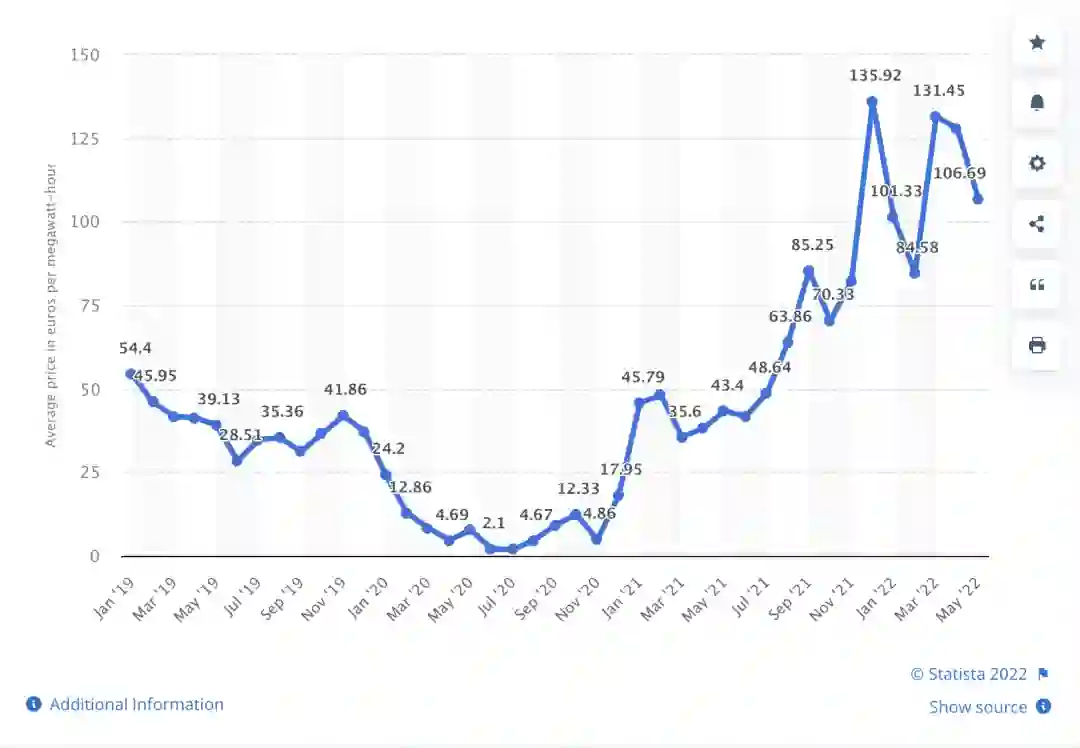 2019年1月至2022年5月挪威月平均电力批发价格,单位:每兆瓦时欧元,图源statista