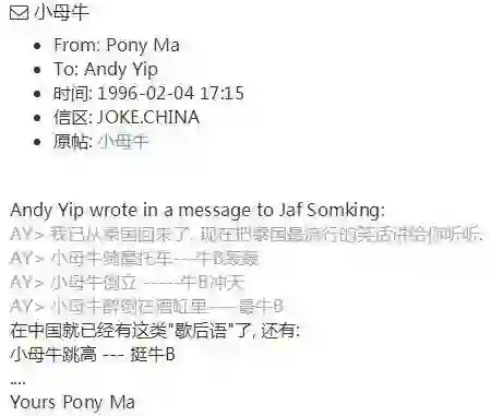 1994 年,马化腾加入 CFido,还经常在平台上和网友讲关于小母牛的歇后语段子。