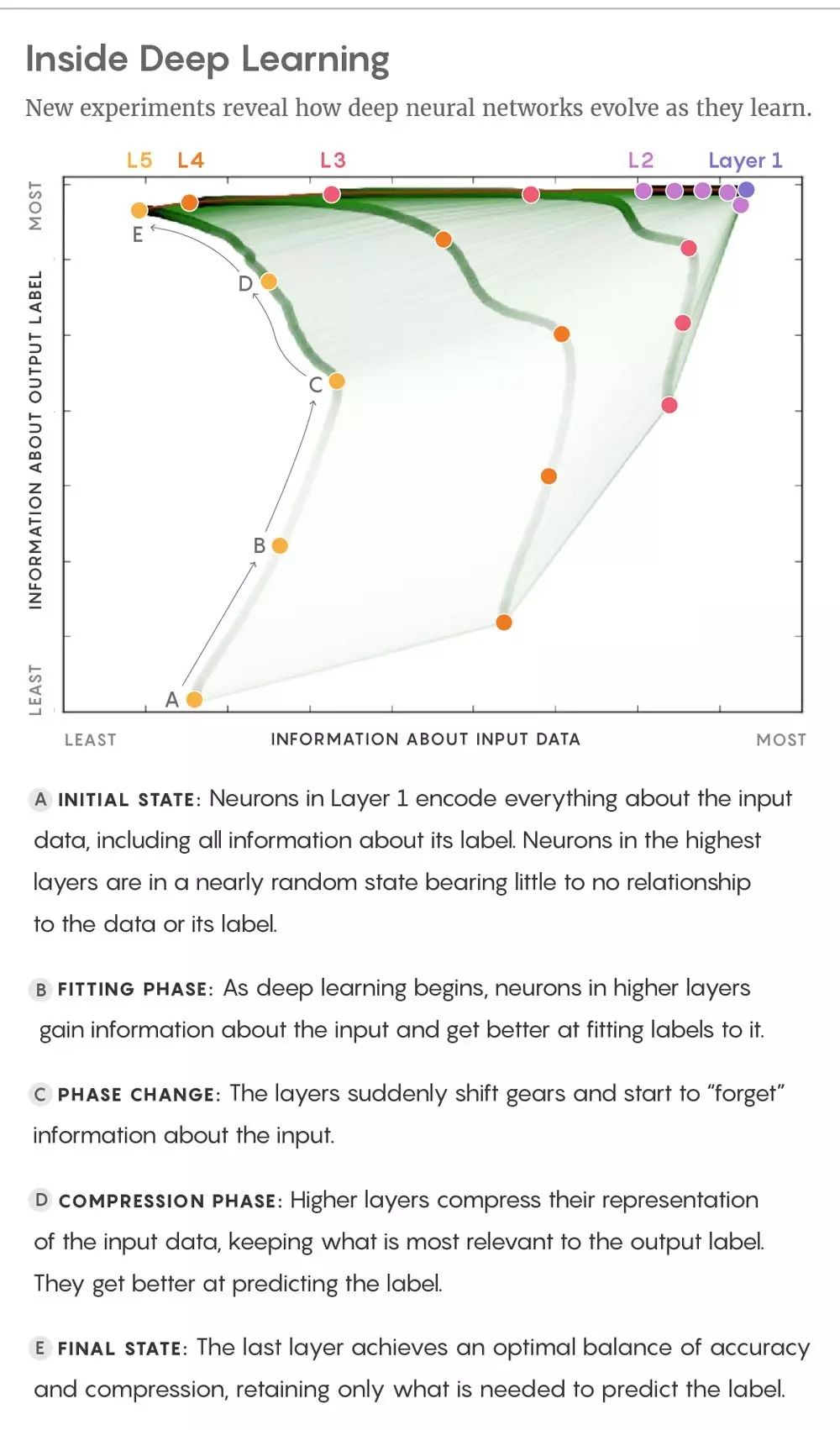 尽管这一隐藏在深度神经网络后面的概念已经讨论了几十年,但是它们在语音识别、图像识别等任务中的表现在 2010 年代才出现较大的发展,这和优化的训练机制、更强大的计算机处理器息息相关。2014 年,Tishby 阅读了物理学家 David Schwab 和 Pankaj Mehta 的论文《An exact mapping between the Variational Renormalization Group and Deep Learning》(变分重整化和深度学习之间的映射关系),认识到他们与信息瓶颈原则的潜在联系。