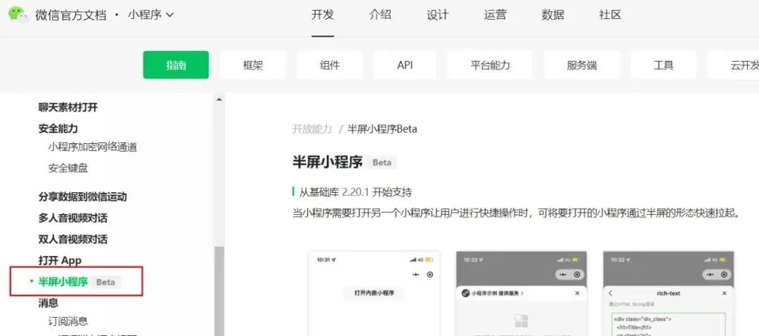 微信小程序官方开发文档近日上线了一个新功能,将支持 “ 半屏小程序 ” ,该功能目前还处于内测阶段。