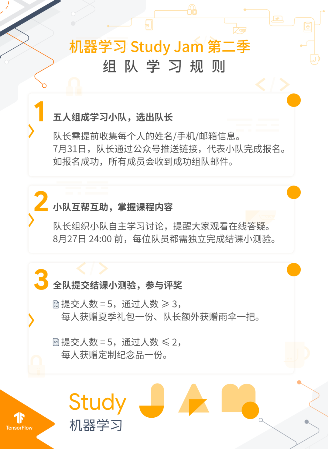 不论你是刚接触 TensorFlow,想第一次尝试上手的新朋友;还是此前了解过 Study Jam,却不小心错过课程的老朋友 —— 这个夏天,让我们携手组队再相聚,一起学习《TensorFlow 2》最新中文课程,在谷歌开发者专家 (GDE) 的帮助下快速排难入门,挑战三周内( 7 月 31 日 - 8 月 27 日)上手各种新技能!