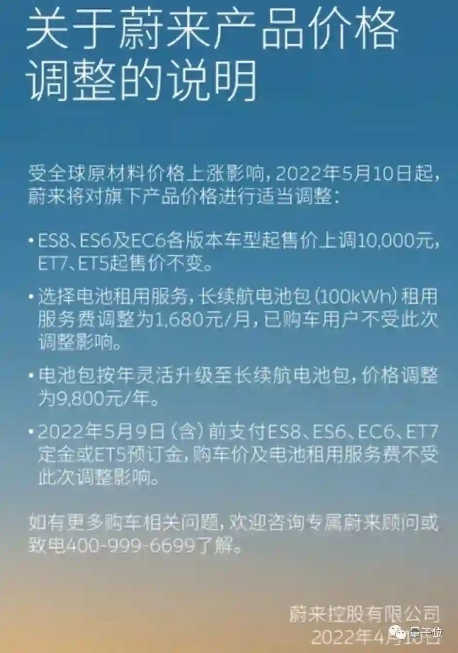 此外,蔚来还宣布,由于全球原材料价格上涨的原因,ES6、ES8、EC6等车型将在2022年5月10日起上涨1万元,ET7、ET5价格不变。