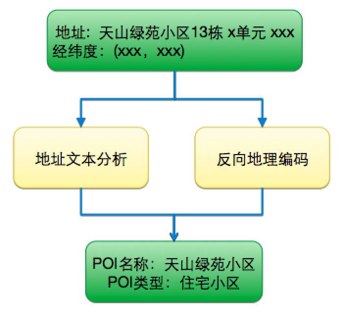 上图是我们订单地址分析的流程。根据订单系统中的用户订单地址文本,基于自然语言处理技术对地址文本分析,可以得到地址的主干名称(指去掉了楼宇、门牌号的地址主干部分)和地址的类型(写字楼、住宅小区等)。在此基础上通过一些地图数据辅助从而判断出最终的地址类型。