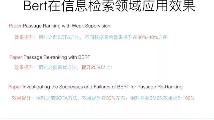 尽管讲了这么多领域间的区别,但是其实也没什么用,如果你看目前见到的用 Bert 改进检索领域的工作,尤其是 Passage 级别的信息检索问题,可能你无法分辨现在在做的是搜索问题还是 QA 问题。当然,对于长文搜索,搜索还是有单独的问题需要处理。为何会出现这种无法分辨 QA 及搜索任务的现象呢?这是因为目前出现的利用 Bert 改进检索的工作,一方面比较集中在 Passage 级别;另外一方面通常任务是 Ad Hoc 检索,以内容匹配为主,与真实搜索引擎利用的主要特征差异比较明显。主要应该是这两个原因造成的。