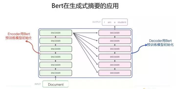 很明显,生成式摘要任务,从技术体系来说,符合典型的 Encoder-Decoder 技术框架:原始文章从 Encoder 输入,Decoder 生成语句作为摘要结果。既然是这样,要想利用 Bert 的预训练成果,无非体现在两个地方,一个地方是 Encoder 端,这个好解决,只需要用预训练好的 Bert 模型初始化 Encoder 端 Transformer 参数即可,简单直观无疑义;