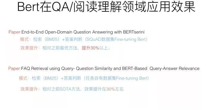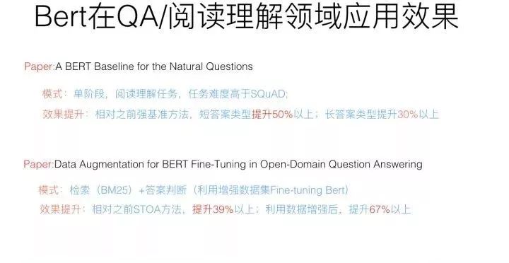 前面提过,QA 领域可能是应用 Bert 最成功的一个应用领域,很多研究都证明了:应用 Bert 的预训练模型后,往往任务都有大幅度的提升。下面列出一些具体实例。