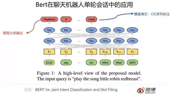论文「BERT for Joint Intent Classification and Slot Filling」即是利用 Bert 解决单轮会话的会话意图分类以及槽位填充任务的。解决方法也很直观,输入一个会话句子,Transformer 的 [CLS] 输入位置对应高层 Transformer 位置输出句子的意图分类,这是一个典型地应用 Bert 进行文本分类的方法;