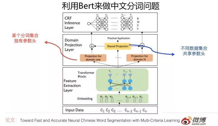 它使用 Bert 预训练的 Transformer 作为主要特征抽取器,针对不同数据集合可能分词标准不同,所以在 Transformer 之上,为每个分词数据集合构建一个独有的参数头,用来学习各自的标准。同时增加一个共享的参数头,用来捕捉共性的信息。