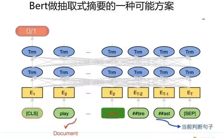 两者之间加个分隔符 <SEP>;输出部分则要求最开始的 [CLS] 输入位置对应的 Transformer 最高层输出 0/1 两种分类结果,如果结果是 1,则意味着这个句子可以作为摘要句,0 则意味着此句不会作为摘要句。