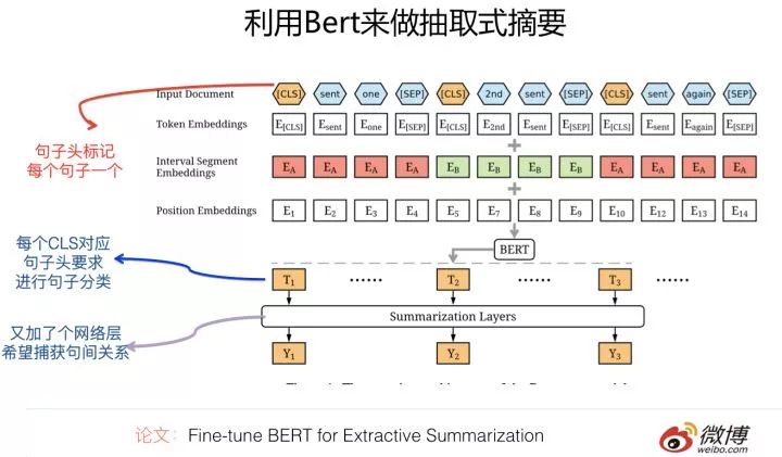 目前有个论文(Fine-tune BERT for Extractive Summarization)是做抽取式文本摘要的。它的具体做法基本遵循上面讲的方法二的框架,在输入部分用特殊分隔符分隔开不同的句子,每个句子加入句子头标记 <CLS>,在输出部分则要求在输入为 < CLS > 位置对应的 Transformer 最高层 embedding 之上,构建输出层,用来判断这个句子是否会被选为摘要句子。