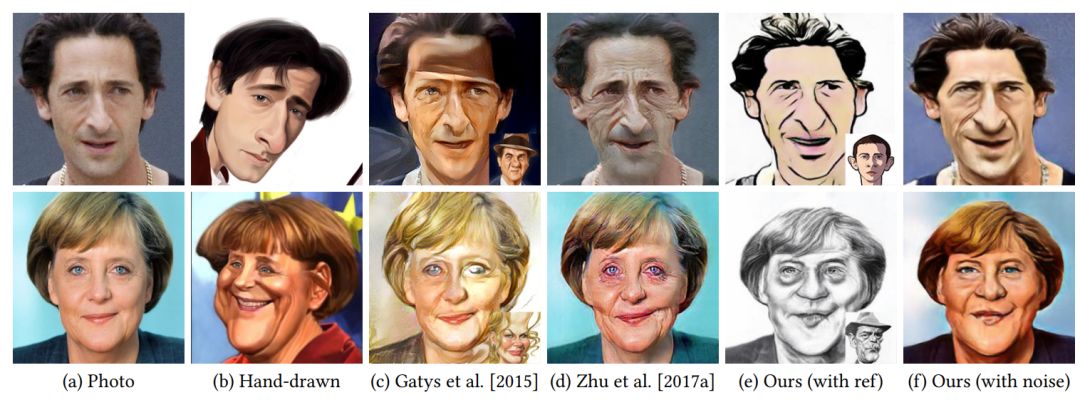 图 1. 人脸漫画化结果对比。(b)为手绘漫画,(c)为风格迁移自动生成,(d)为 CycleGAN,(e)和(f)为新论文的结果。其中(d)(e)(f)都是在同一个数据集上进行训练的。
