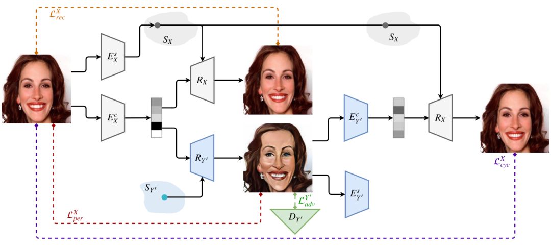 图 8:CariStyGan 架构。为简洁起见,此处我们仅展示了 X → Y ′ 变换的网络架构。Y ′ → X 变换的网络架构与该架构对称。输入图像来自 CelebA 数据集。
