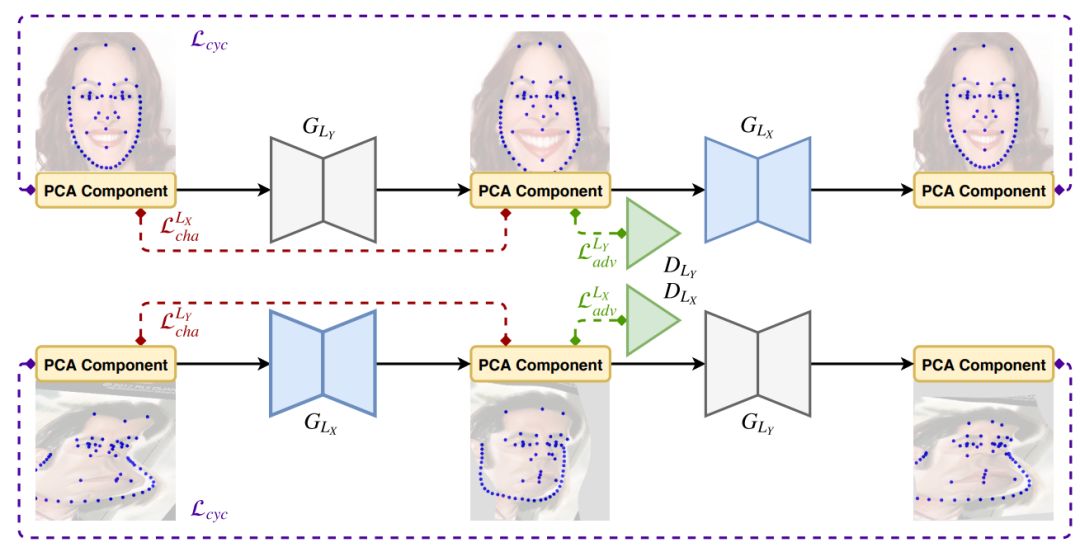 图 4:CariGeoGAN 的架构。它基本上遵循 CycleGAN 的网络结构,cycle Loss 为 L_cyc,对抗损失为 L_gan。但是我们的输入和输出是向量而非图像,我们添加了 characteristic loss L_cha 以增加人物的独特特征。