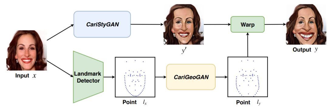 为了构建非成对图像间的关系,CariGeoGAN 和 CariStyGAN 都使用 cycle-consistency 的网络结构,它广泛应用于交叉领域或无监督图像转换任务中。最后,夸张的形状对经过风格迁移的人脸进行变形,从而获得最终的输出结果。