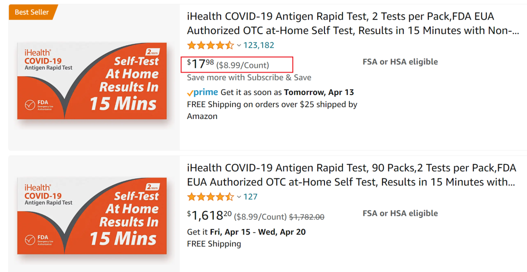按照九安医疗1月公告与美国ACC的合同,约合为5.1美元/人份(32元人民币),批量采购的价格远超国内和欧洲的价格。零售市场,九安子公司iHealth的OTC家用抗原试剂盒在亚马逊的单价约合9美元/人份(57元人民币)。