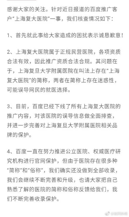 5.百度回应“复大医院”事件:确实误导了网民的就医选择