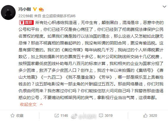 9月9日晚,冯小刚发文怒斥恶意造谣者,称自己从没有所谓的阴阳合同,更没偷逃税且皆有据可查。近十年来拍摄的《集结号》《唐山大地震》《芳华》等电影没有一部主角片酬超五百万,望造谣者不要煽动和绑架民间戾气,拿影视行业当出气筒。