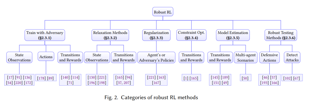 鲁棒强化学习旨在确定性地或统计地提高算法在面对不确定性和对抗性攻击时的最差性能。训练任务和测试任务之间的差异普遍存在。例如,在连续控制任务中,真实的物理参数可能与仿真中不同,而在自动驾驶场景中,周围的智能体可能具有新颖的驾驶行为。这种差异促进了鲁棒RL的发展。此外,现实世界应用程序的安全关键特性使得鲁棒性成为帮助避免灾难性故障的重要特性。研究RL中有效的攻击和防御的兴趣激增。这两个领域的详细综述可在[28,76,121]中找到。在本节中,我们首先从不同MDP组件(包括观察/状态、操作、转换和奖励)对不确定性的鲁棒性方面总结第2.2节中的鲁棒性RL公式。然后,我们在第2.3节中提出了鲁棒训练和测试方法,以提高对每个组件的不确定性或人为设计的攻击的鲁棒性。我们在图2中总结了鲁棒RL方法。最后,我们在第2.4节中介绍了用于测试所提议的鲁棒RL算法的鲁棒性的应用程序和基准。