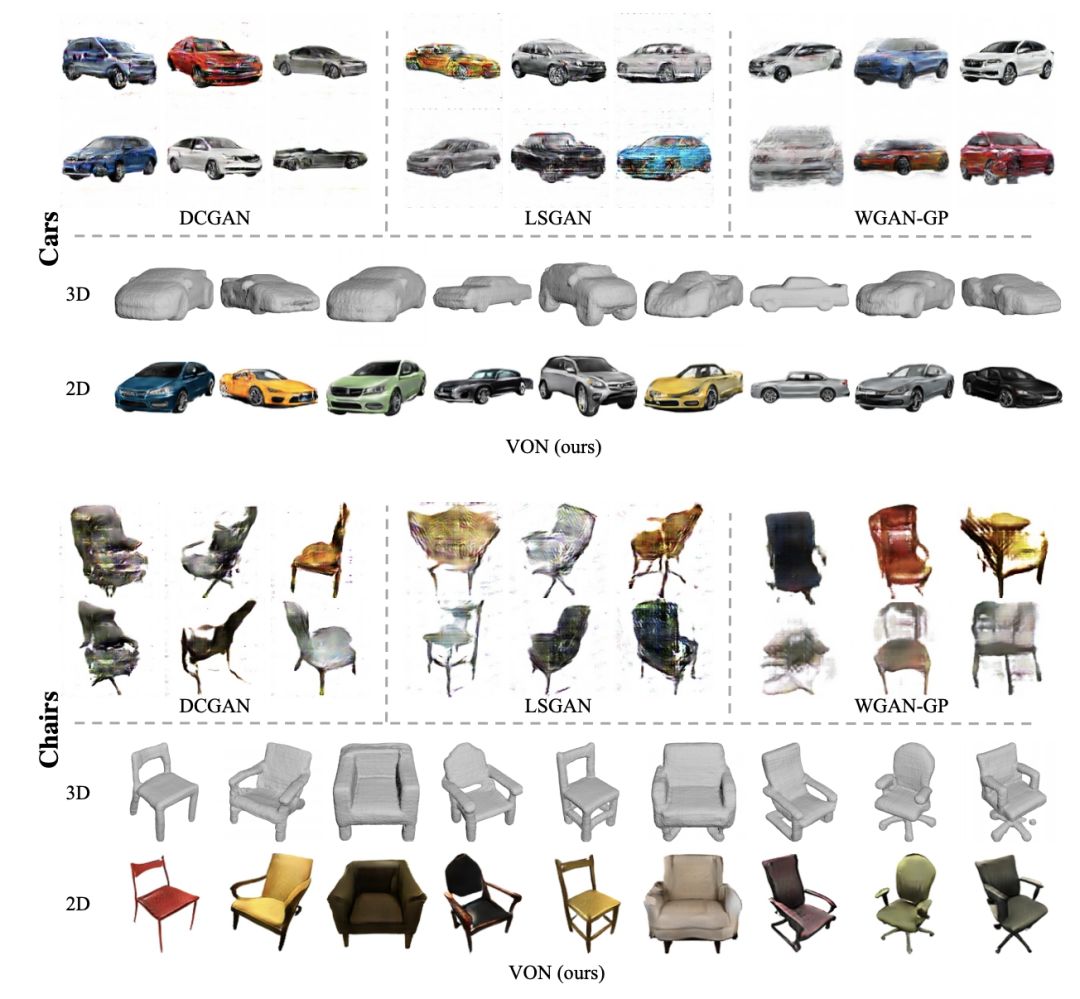为了评估图像生成模型,团队计算了用于生成三维模型的Fréchet初始距离 。此外,他们还向亚马逊的Mechanical Turk上展示了200对由VON和最先进的模型生成的图像,被试者的任务是在每对图像中选择更加真实的结果。