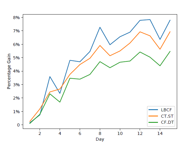 进一步,该研究在快手的真实智能营销场景下部署了 LBCF 算法,进行了两周的 A/B 实验,如图 6,结果也证明了该算法的有效性,与 CT.ST 和 CF.DT 算法相比,收益分别提高了 0.92 和 2.48 个百分点。