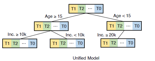 本文提出的多元因果森林模型,模型结构如图 2(示意的例子),该模型结构有两个优点:第一,单一一个模型能够同时处理任意种干预手段,否则,几种干预手段就需要维护相应数量的二元因果森林模型;第二,HTE 的定义要求各干预手段对应一致的特征子空间,该模型结构保证了这一点,这对准确估计 HTE 至关重要。