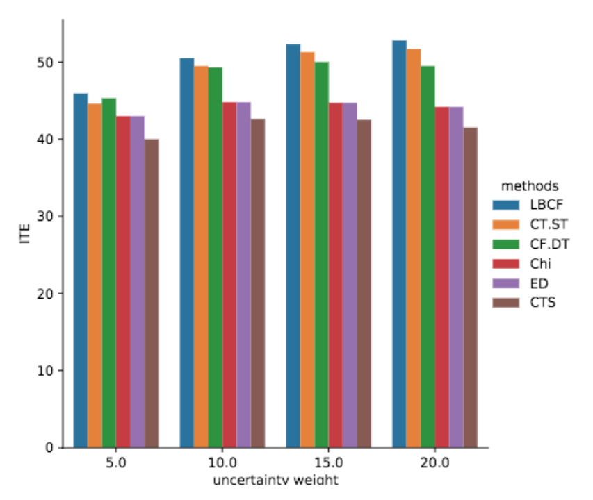 为了公平的对比算法效果,首先,该研究利用 Ye Tu 等人在 WWW 2021 公开的仿真数据集【2】,与业界主流的以树为基础的因果模型进行了线下对比,如图 5,横轴是数据集噪声的强弱,纵轴是研究者关注的核心指标的收益,可以看出,LBCF 效果最好,CT.ST 和 CF.DT 次之。