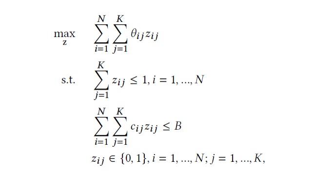 第一步,利用线性松弛技术,把图 3 的整数规划数学模型简化成易于求解的线性规划问题,可以证明松弛后的线性规划问题的解集至多只在预算临界处有一个非整数解。