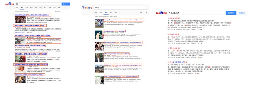 目前关于事理图谱的构建方式上,主要包括领域专家手动构建以及基于海量文本自动化获取两种方法。前者准确率高但构建成本较大,且规模难以快速增长;后者所见即所得,构建成本较低,规模可快速扩充,能够迅速挖掘出海量逻辑,但缺点是精确度受多方面因素影响,准确率较前者要低。事实上,目前事理逻辑广泛存在于海量文本当中,当我们打开百度或者谷歌搜索引擎,输入“导致”或者“lead to”这一词时,会返回多个包含因果事理的结果,如图8所示。此外,问答社区等资源也为基于海量文本自动化获取事理逻辑提供了可能。