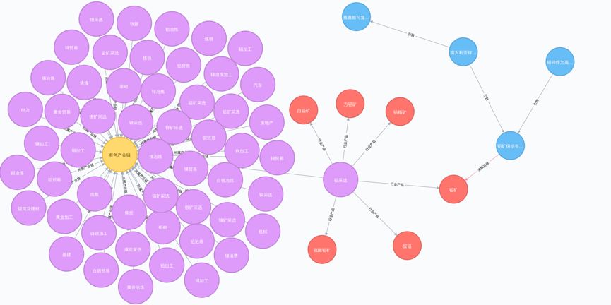 除公司知识图谱与事理图谱的融合之外,我们在产业链知识图谱和事理图谱融合的工作上进行了尝试,如图14所示展示了“澳大利亚锌矿执行复产计划事件”的融合效果子图(部分),从“澳大利亚锌矿执行复产计划事件”缓解相关铅产量恢复等事件出发,可以将事件与“铅”商品这一商品、有色产业链等行业板块类实体与行业相链接,进一步找到相应的商品、个股等信息,通过这种链接和融合,可以进一步对事件进行知识信息的扩展,形成从事理到知识概念的通路。