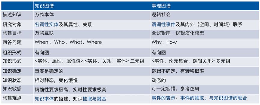 与知识图谱的组织形式相仿,实体通过头尾相连,可以组织形成图谱状的知识图谱,事理采用类似的组织方式,可以形成事理图谱。知识图谱与事理图谱两者之间存在着诸多异同之处,我们在参考前人的工作上,结合自己的研究工作,从描述知识、研究对象、构建目标、知识形式等共10个方面进行了总结,如图6所示: